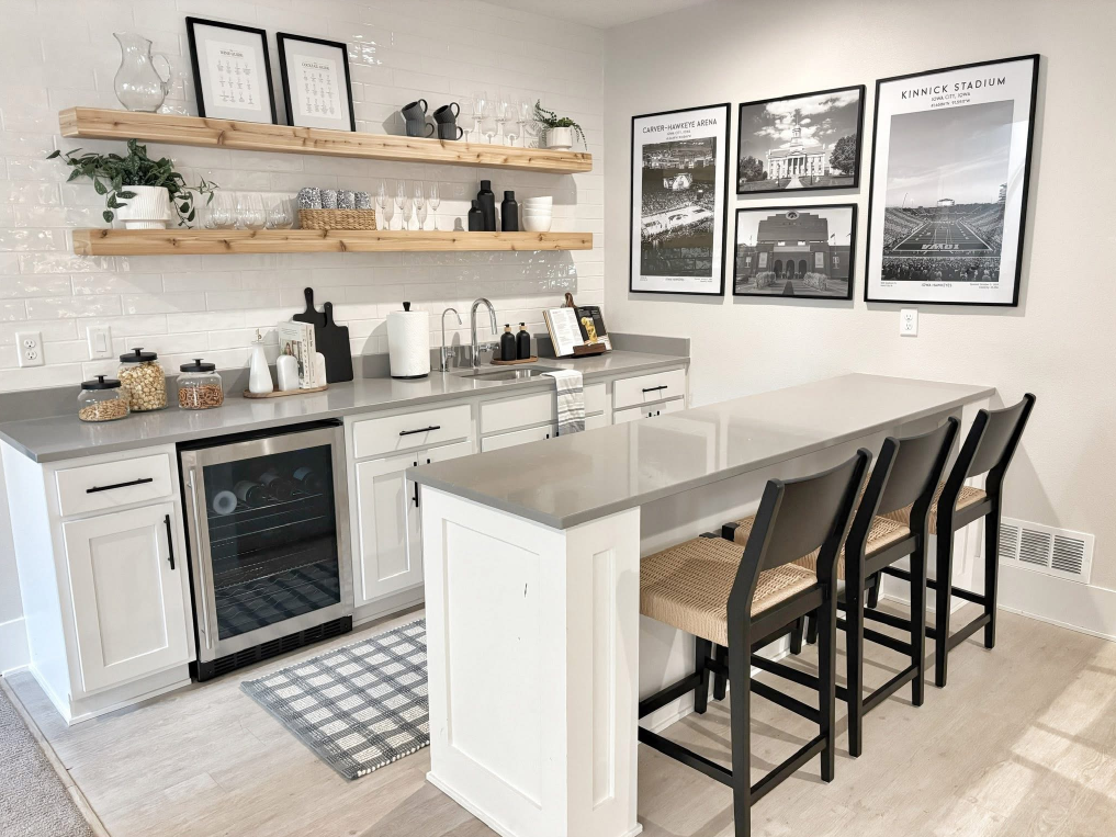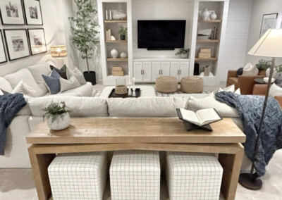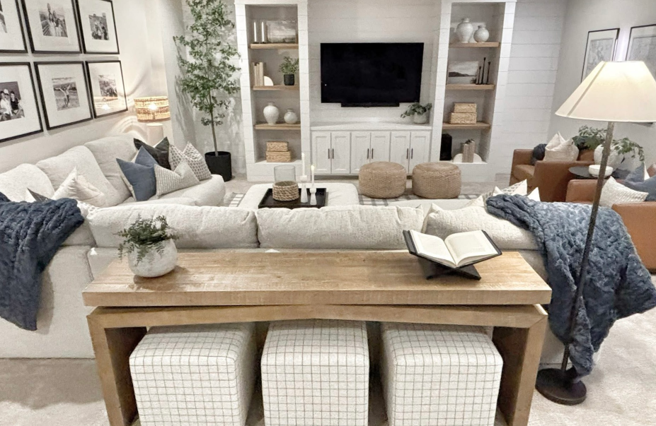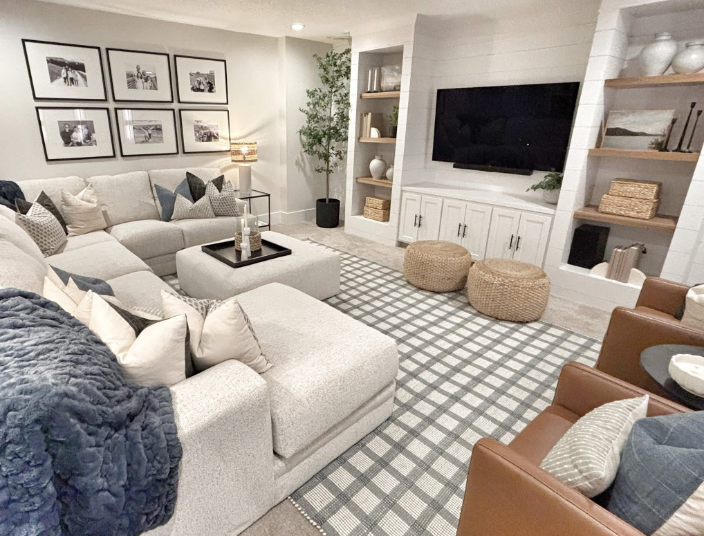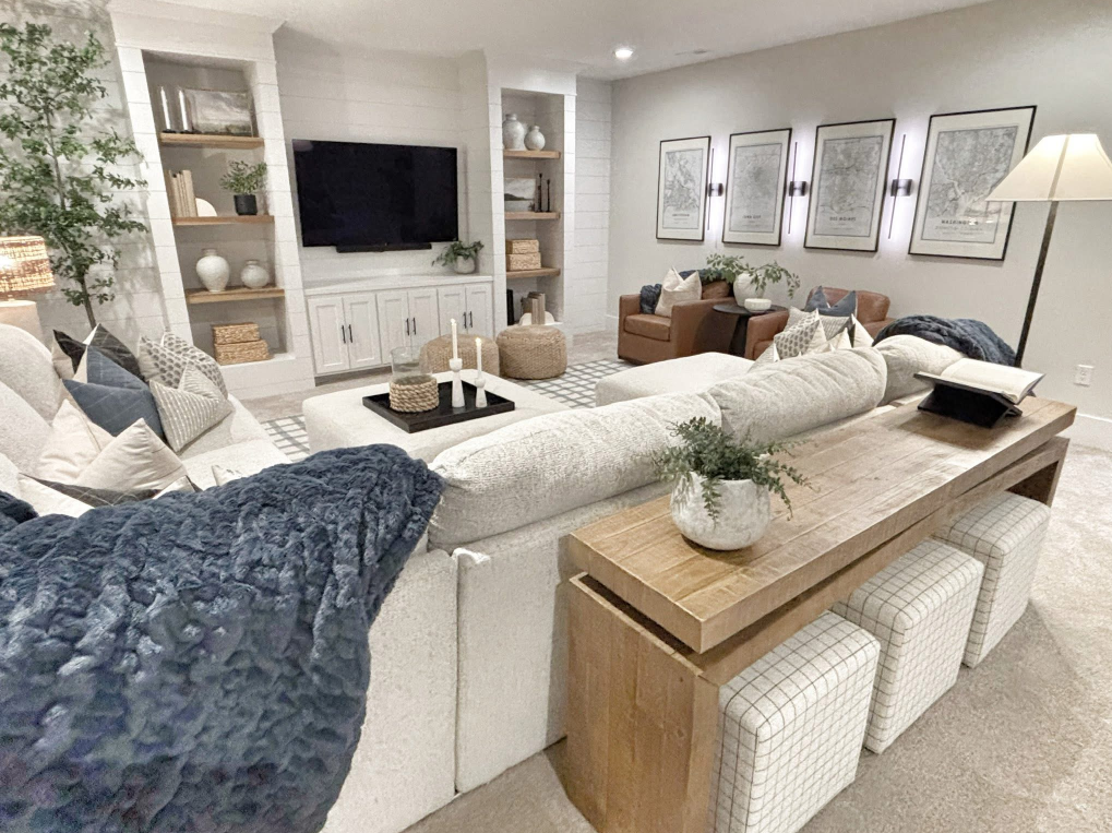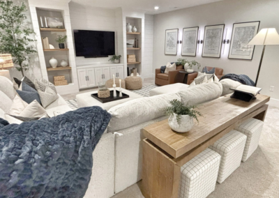 Everyday Family Living A warm, neutral basement retreat that blends cozy seating, functional entertaining space, and timeless layered textures—perfect for relaxing, hosting, and everyday family living.