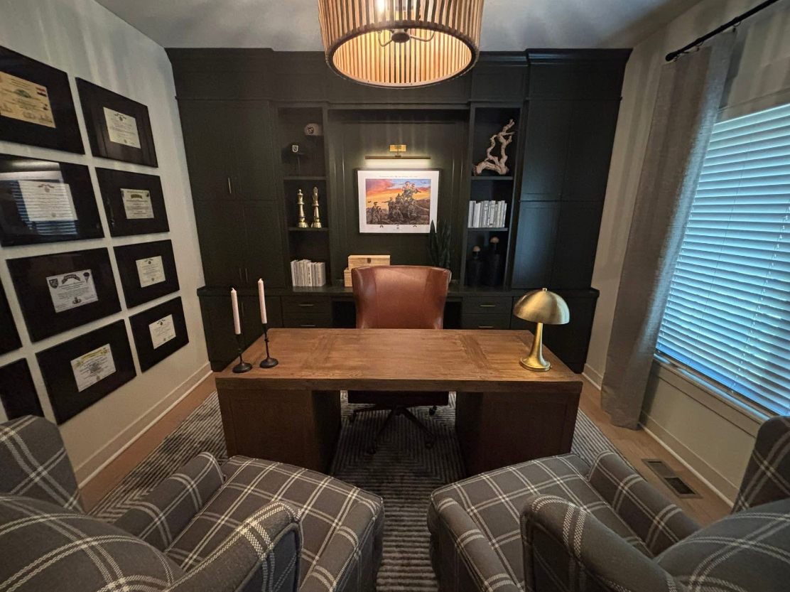 A home office designed to inspire focus and confidence ✨ Custom built-ins, deep moody tones, and warm wood textures create a space that feels both powerful and inviting.