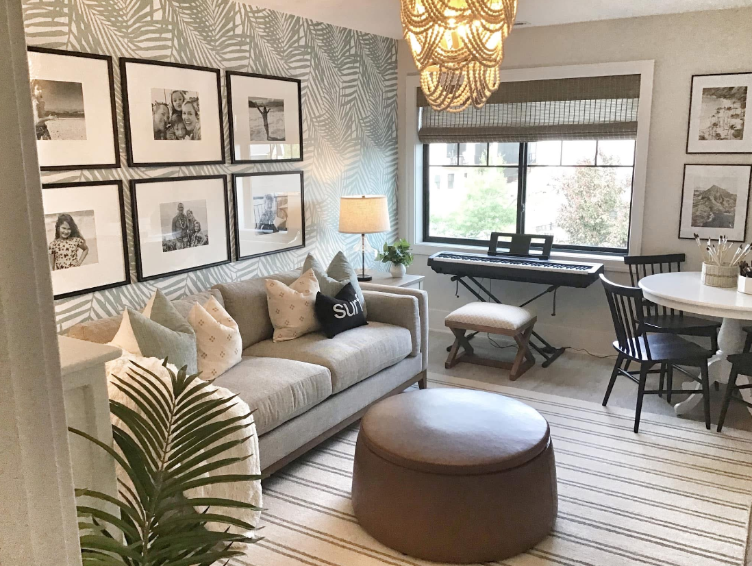 A light, cheerful multi-purpose room with soft neutrals, playful pattern, and warm textures—blending lounge, music, and craft space into one inviting, lived-in retreat.