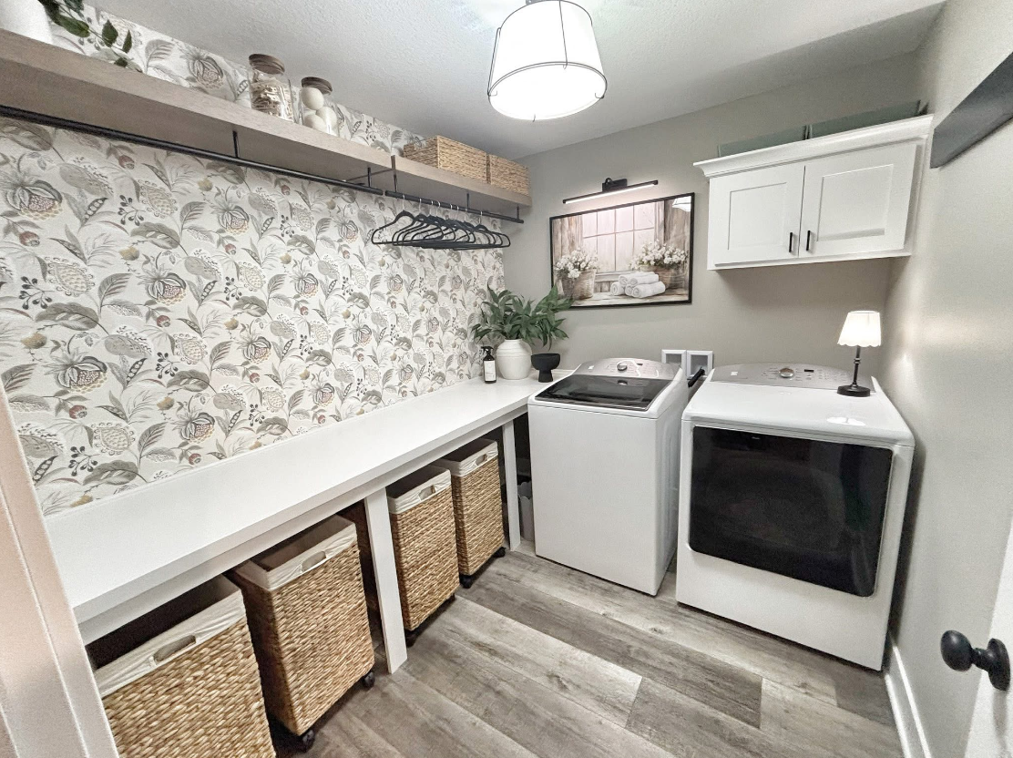 Proof that laundry rooms can be pretty ✨ Thoughtful storage, soft wallpaper, and clean lines turn this everyday space into one that feels calm, organized, and functional.